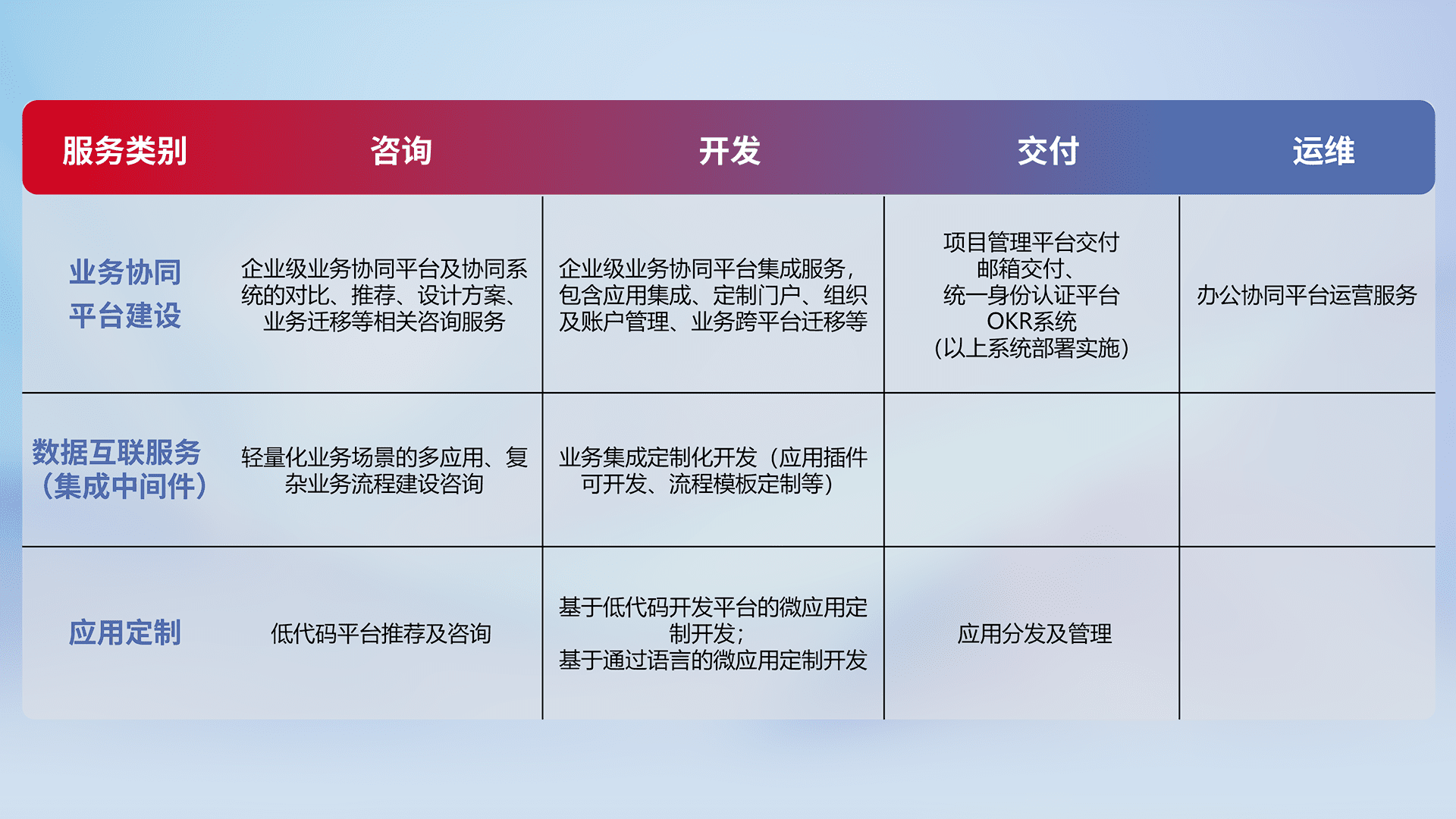 针对钉钉、、企微、、IDaas等平台级产品提供产品的规划、、方案、、、交付、、定制化开发等服务,,,,实现如统一协同办公、、智能客户服务、、、、混合会议管理、、智能数据查询、、、、等业务场景,,,实现数字化转型。。